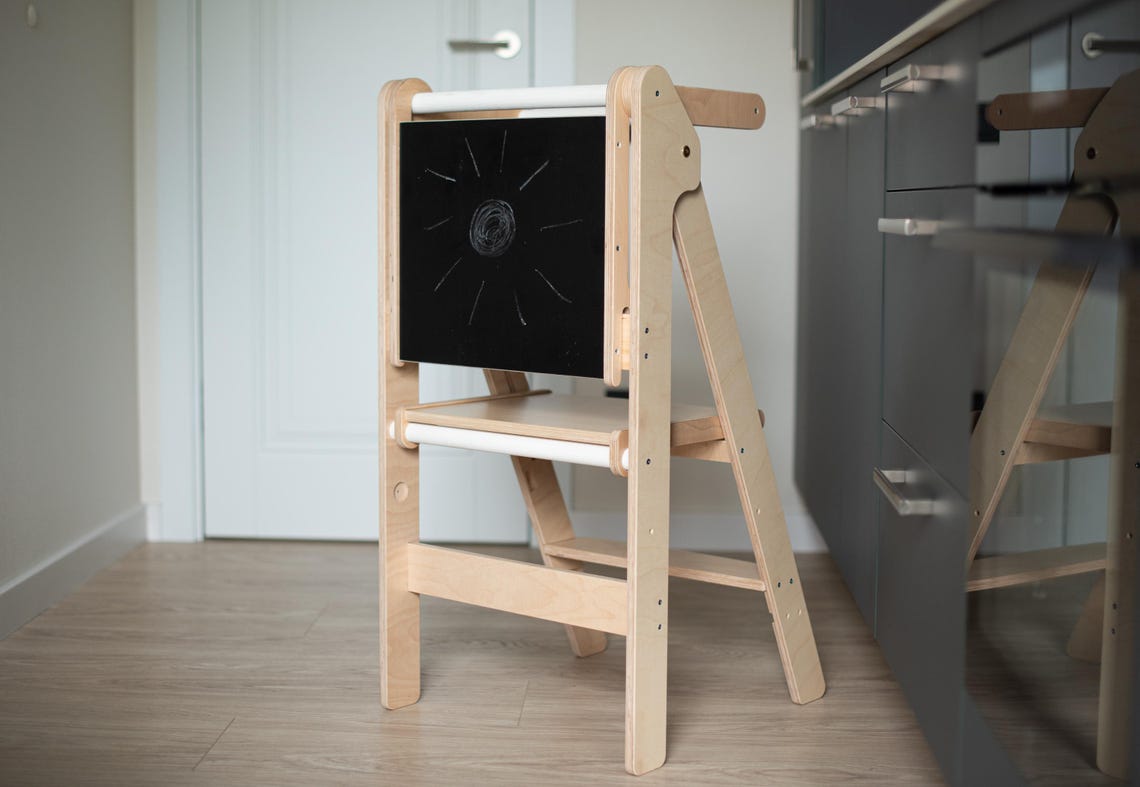 Foldable and height adjustable kitchen tower with chalk board for kids